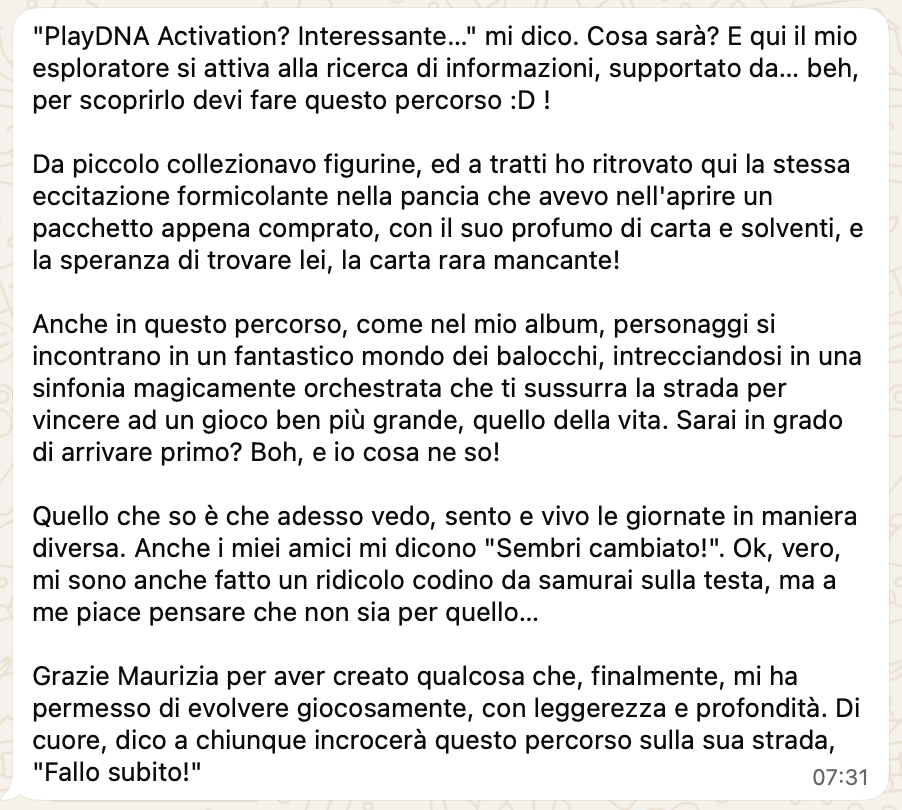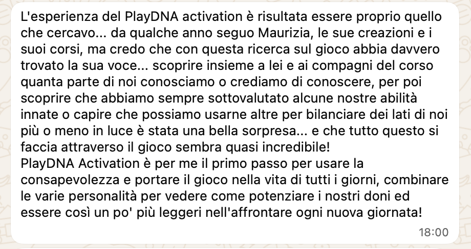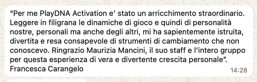 Per me PlayDNA Activation e’ stato un arricchimento straordinario. Leggere in filigrana le dinamiche di gioco e quindi di personalità nostre, personali ma anche degli altri, mi ha sapientemente istruita, divertita e resa consapevole di strumenti di cambiamento che non conoscevo. Ringrazio Maurizia Mancini, il suo staff e l’intero gruppo per questa esperienza di vera e divertente crescita personale.