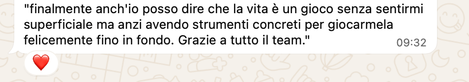 finalmente anch'io posso dire che la vita è un gioco senza sentirmi superficiale ma anzi avendo strumenti concreti per giocarmela felicemente fino in fondo. Grazie a tutto il team.
