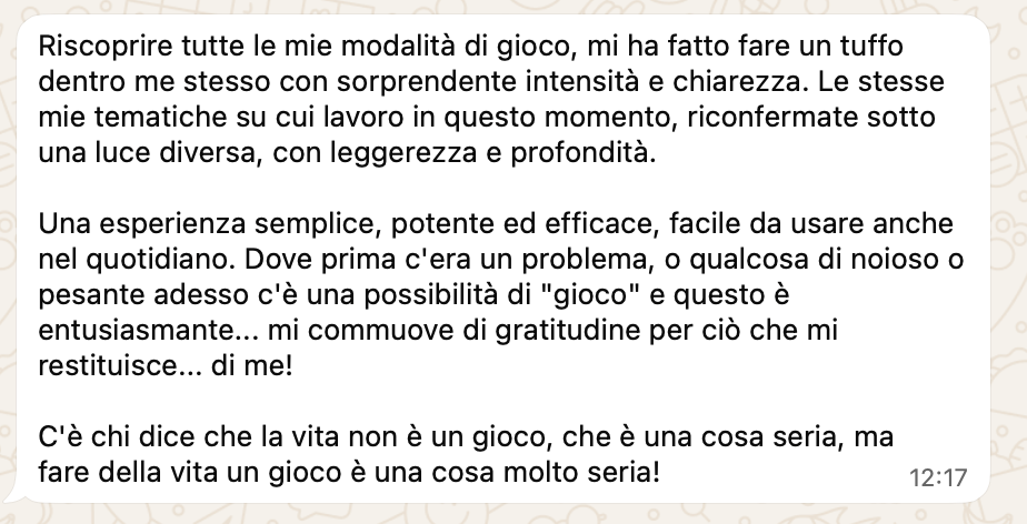 Una esperienza semplice, potente ed efficace, facile da usare anche nel quotidiano. Dove prima c'era un problema, o qualcosa di noioso o pesante adesso c'è una possibilità di "gioco" e questo è entusiasmante... mi commuove di gratitudine per ciò che mi restituisce... di me!