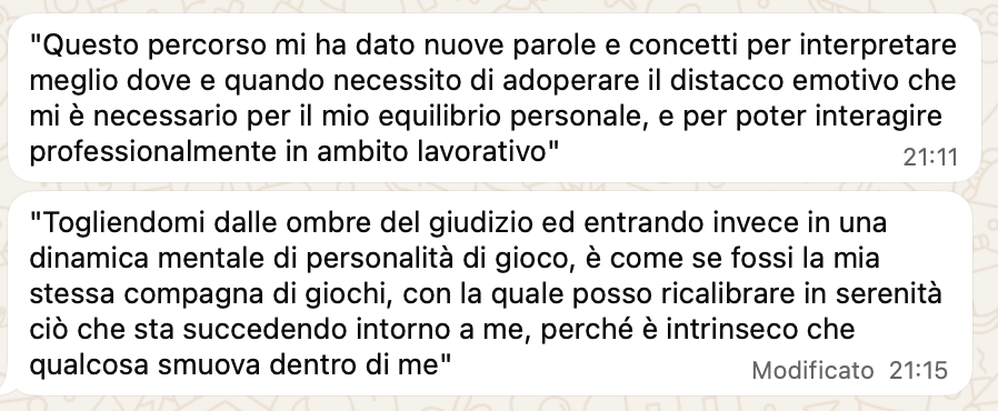 Questo percorso mi ha dato nuove parole e concetti per interpretare meglio dove e quando necessito di adoperare il distacco emotivo che mi è necessario per il mio equilibrio personale, e per poter interagire professionalmente in ambito lavorativo.