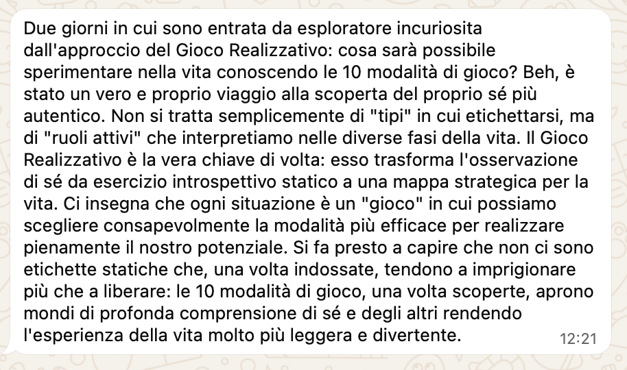 Beh, è stato un vero e proprio viaggio alla scoperta del proprio sé più autentico. Non si tratta semplicemente di "tipi" in cui etichettarsi, ma di "ruoli attivi" che interpretiamo nelle diverse fasi della vita. Il Gioco Realizzativo è la vera chiave di volta: esso trasforma l'osservazione di sé da esercizio introspettivo statico a una mappa strategica per la vita. Ci insegna che ogni situazione è un "gioco" in cui possiamo scegliere consapevolmente la modalità più efficace per realizzare pienamente il nostro potenziale.